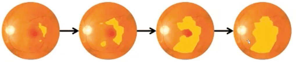 The yellow areas in this illustration show the progression of geographic atrophy.