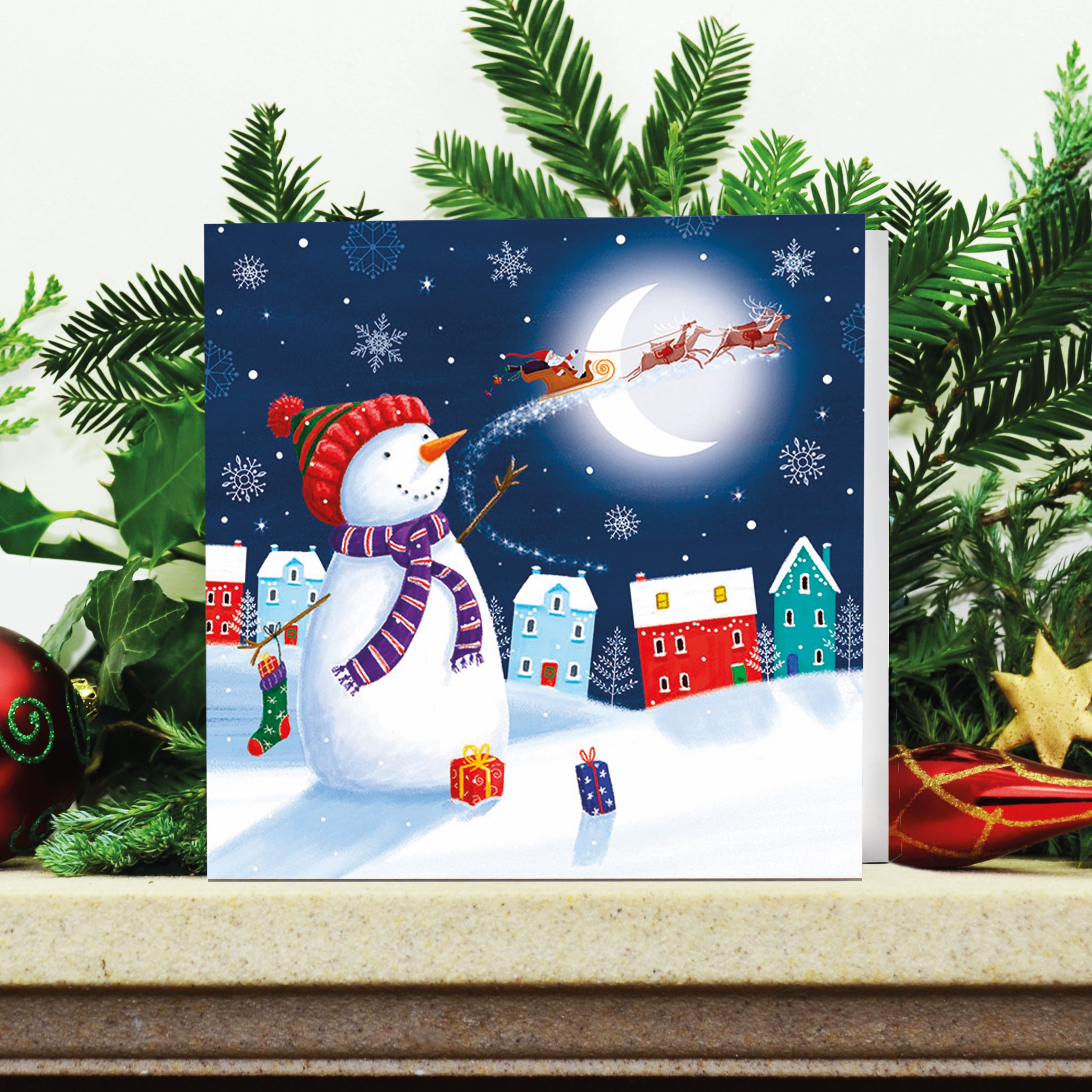 Show someone you are thinking about them this Christmas with this cheerful card showing our smiling snowman who waves at Santa as he and his reindeer fly past the moon on Christmas Eve. Each of our high quality cards comes with a printed greeting and plenty of space for you to write in.