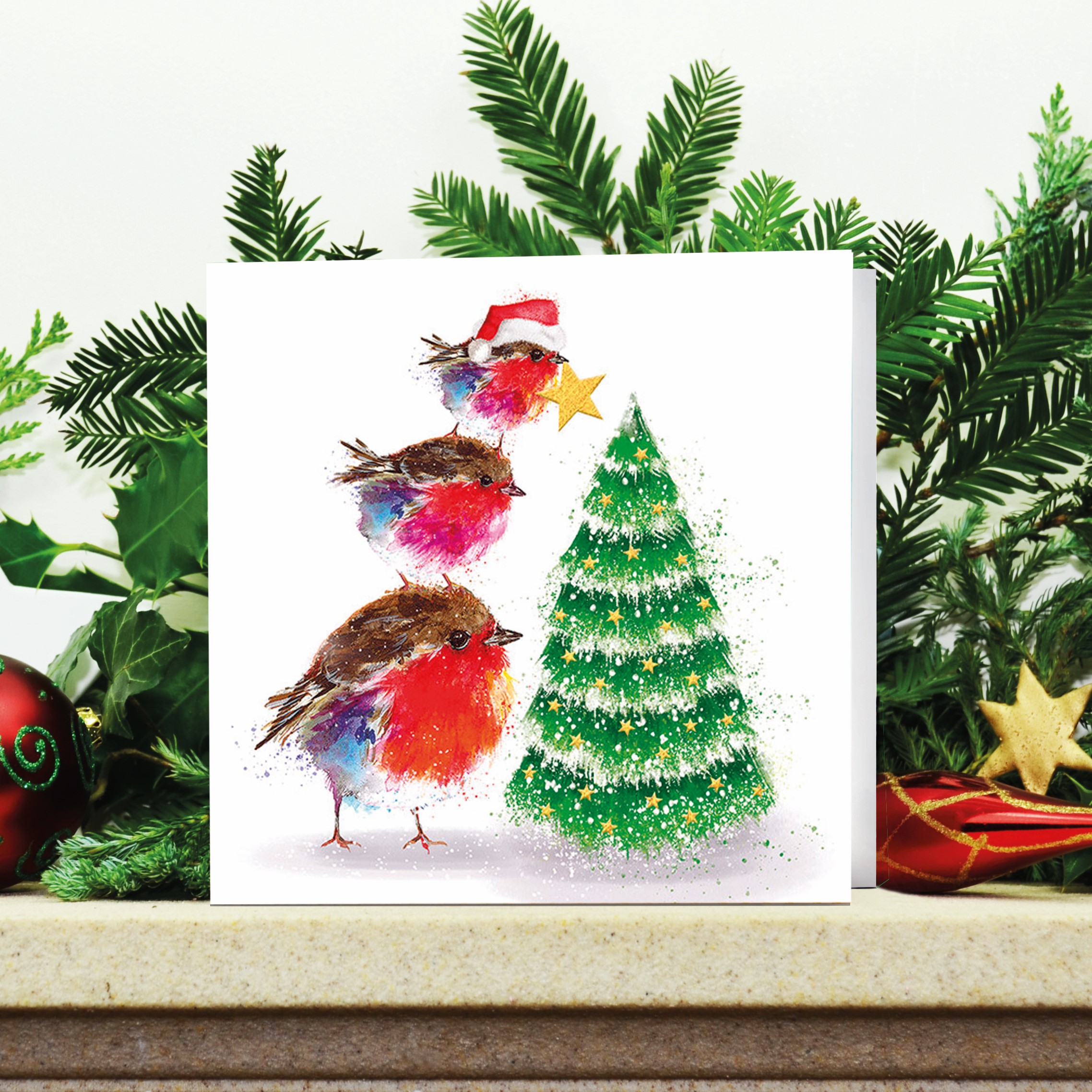 Send loved ones this delightfully cute card showing the smallest, sweetest baby robin who stands on his two feathered family members to put the star on their tree! Each of our high quality cards comes with a printed greeting and plenty of space for you to write in.