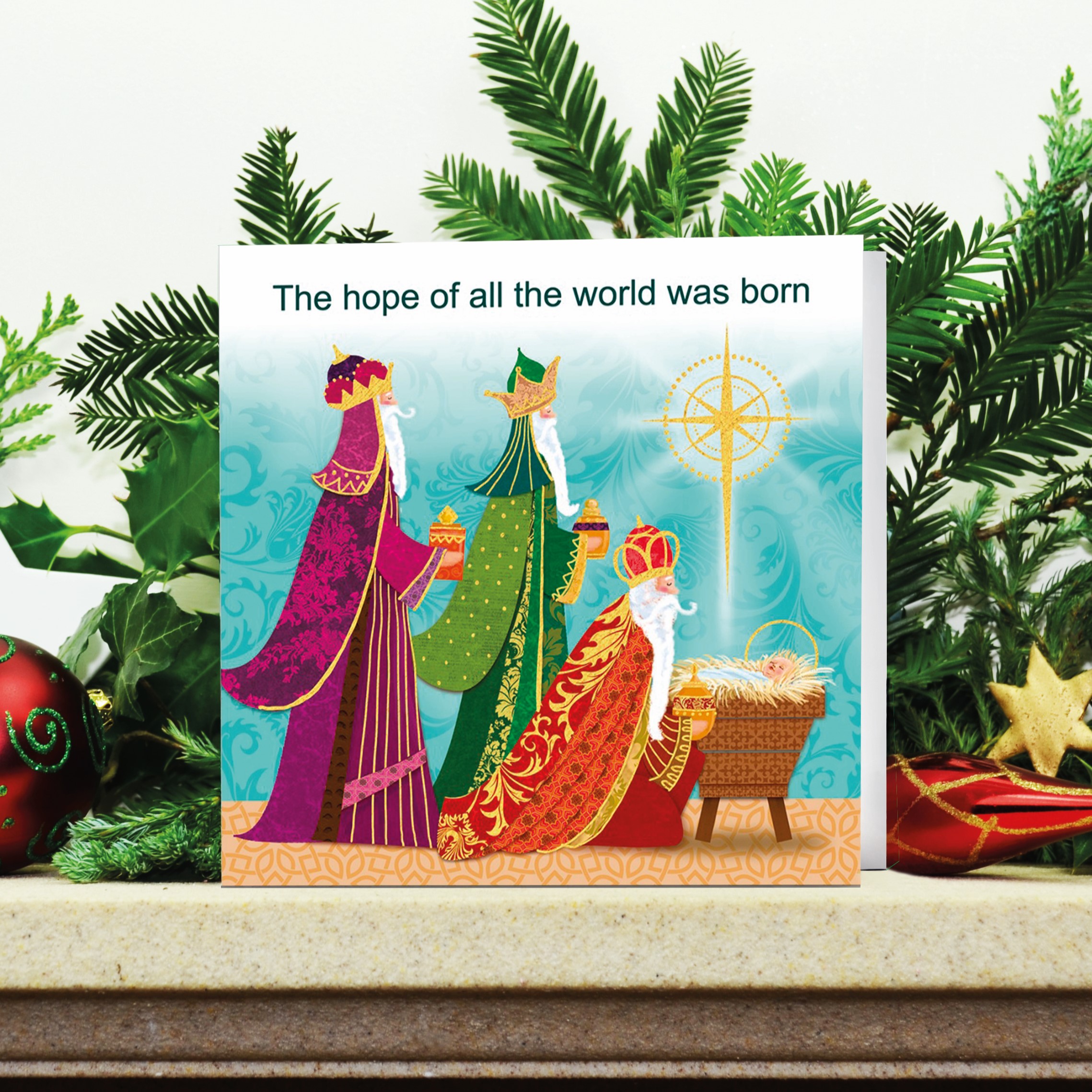 This colourful card will brighten up those dark winter evenings! It features three lavishly dressed Kings greeting baby Jesus with their gifts as he lies in the manger, with a bright star overhead. Each of our high quality cards comes with a printed greeting and plenty of space for you to write in.