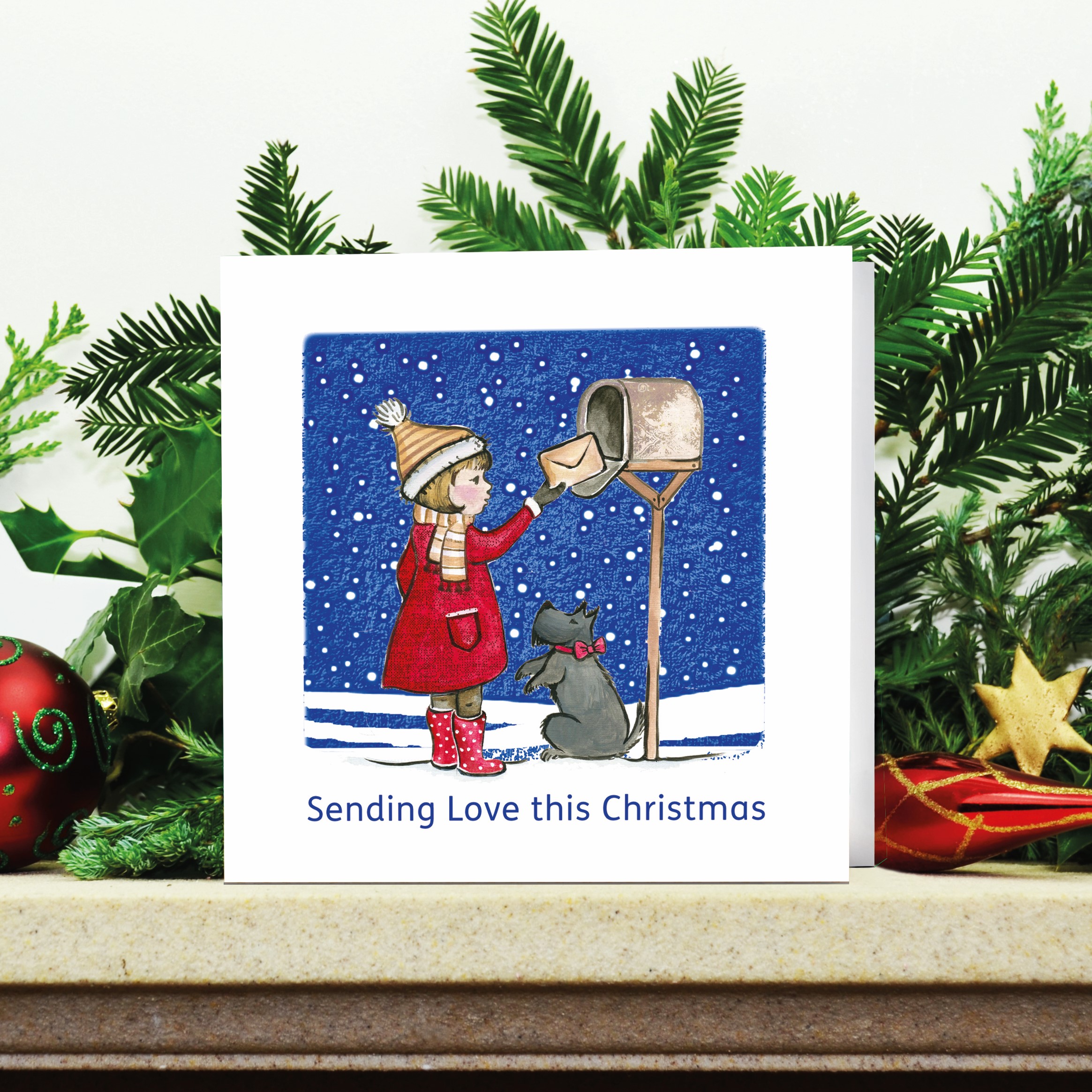 An illustration of a little girl posting a card in the snow with her Scottie dog at her side with the wording on the front: Sending Love this Christmas.