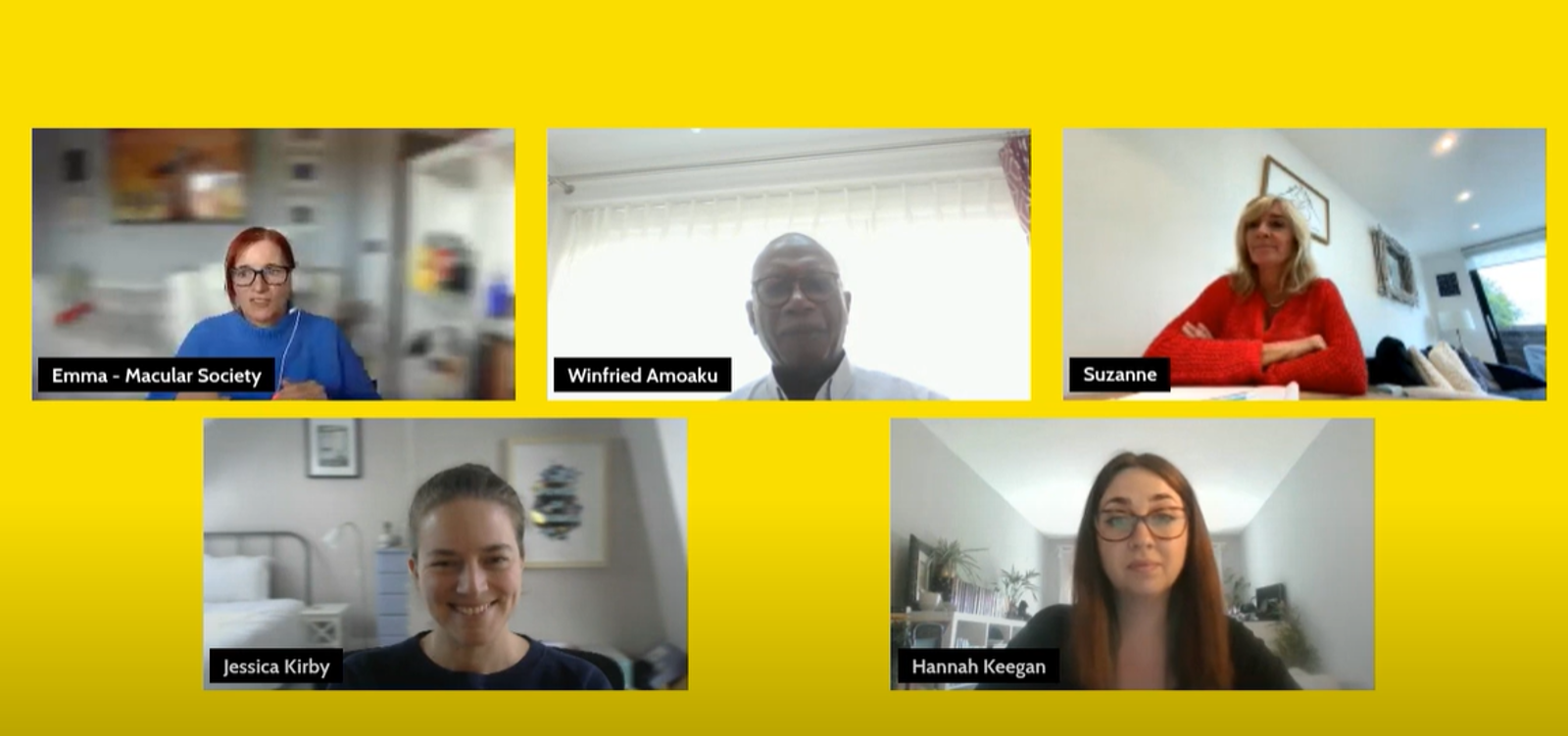 Panel members: Macular Society's Emma Malcolm, director of fundraising and transformation, Jessica Kirby, director of services, Hannah Keegan, programmes coodinator, Suzanne Roberts, counsellor and associate professor Winfried Amoaku, reader in ophthalmology and visual sciences at the University of Nottingham.